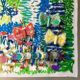 ひびのこづえ「チョウチョブローチ」、「ゲジゲジブローチ」、「kadan」(ハンカチ) 2018