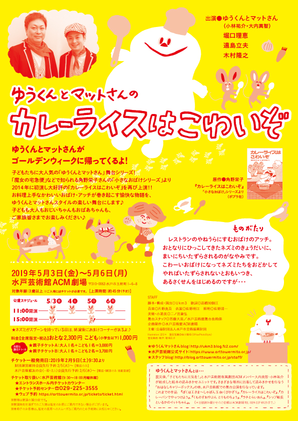 ・これまでの舞台「ぼくは王さま〜しゃぼん玉deくびかざり」「 〃 Remix」「カレーライスはこわいぞ」「カレーパンでやっつけよう」「くものすおやぶん とりものちょう」「ラチとらいおん」「シップ船長といるかのイットちゃん」など。