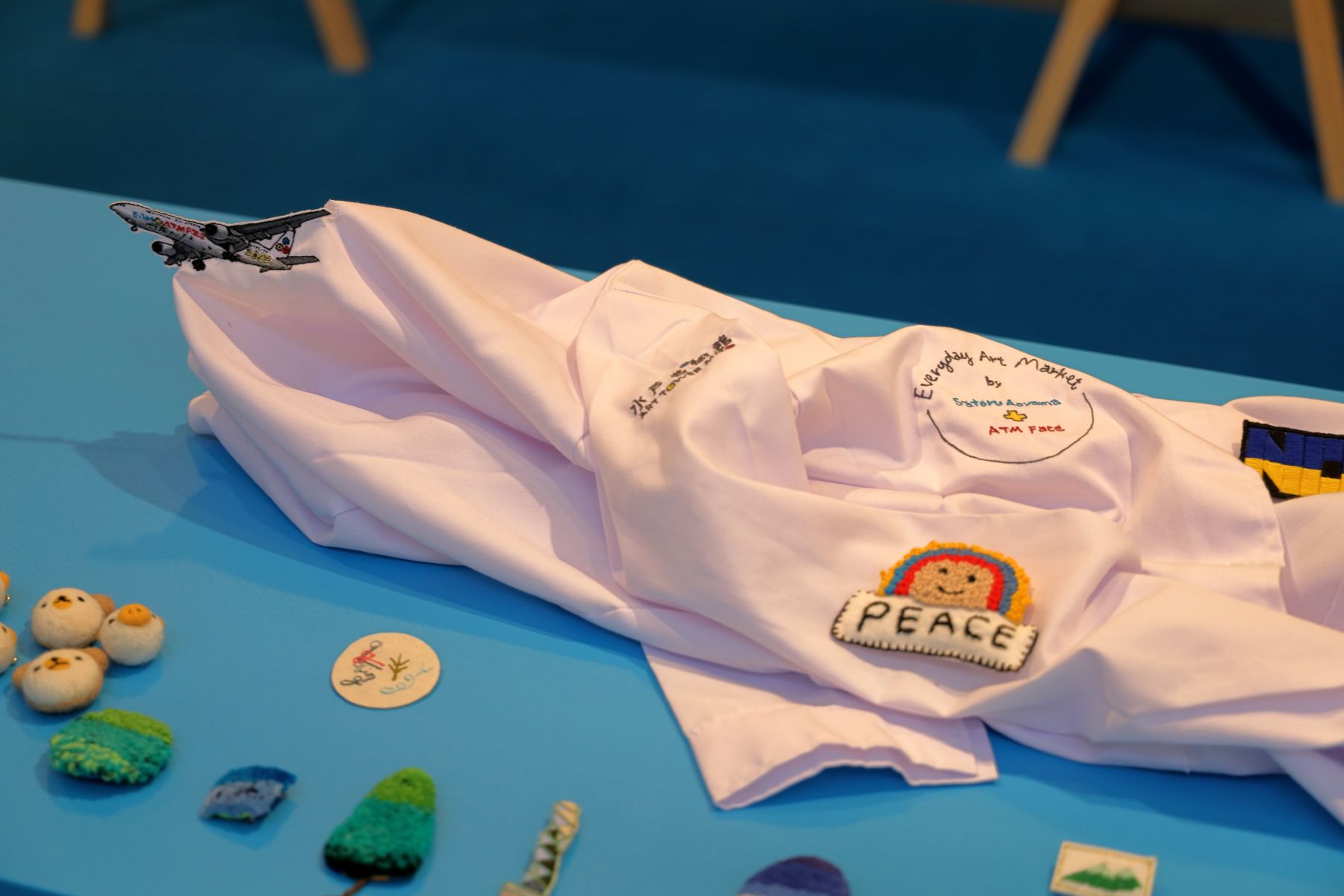 2020年度は、ATMフェイスの手による刺繍がほどこされたマスクとソーシャル・ディスタンスを測るためのメジャーを制作。プロジェクト2年目となった2021年には、着古した勤務時用の制服と蝶々模様のスカーフを再利用し、トランシーバーや消毒液を入れる肩掛けのポーチをメンバー全員でアイディアを出し合い協力しながら制作しました。それらは全てギャラリー勤務時に着用し、実用性だけではなく接客する来館者の皆さまも楽しんでいただいています。