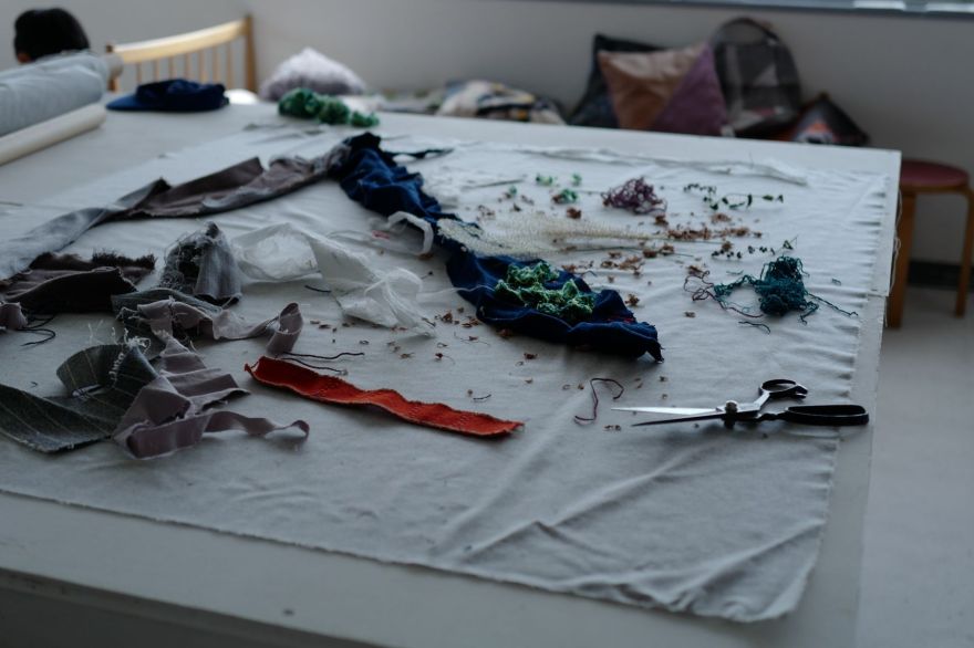 思い出の布や衣類を持ち寄り、端切れや残糸と共に70×90㎝の大きさのウール生地に自由に置いてコラージュします。