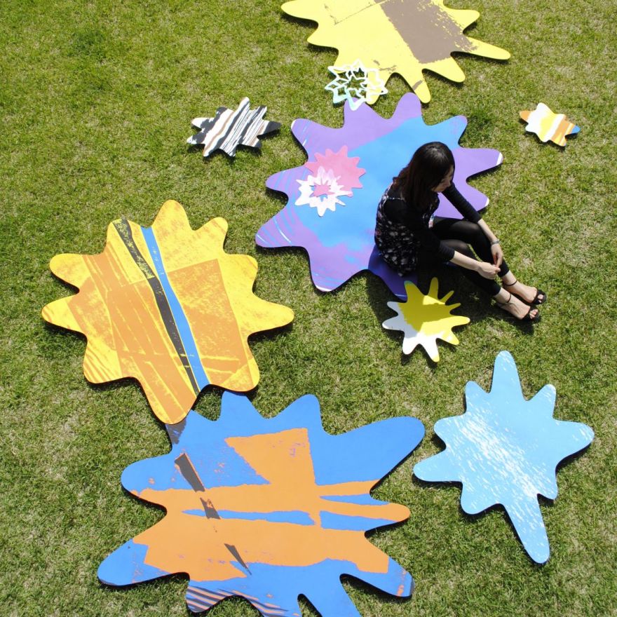 展覧会に出品しているアーティスト・曽谷朝絵さんのもつ、色と音の共感覚世界にふれてみよう!色の混ざりが想定外だったため、市場には出回らない素材をアップサイクルし、水の波紋の形のマットを作ります。また、同じ素材でコースターを作ったり、かつて水戸芸術館での個展でインスタレーション作品の一部だったパーツ(マグネット)からリメイクアクセサリーを制作したり、選択できるプログラムもセットです。ここでしかできないプログラム、ぜひご体験ください。
