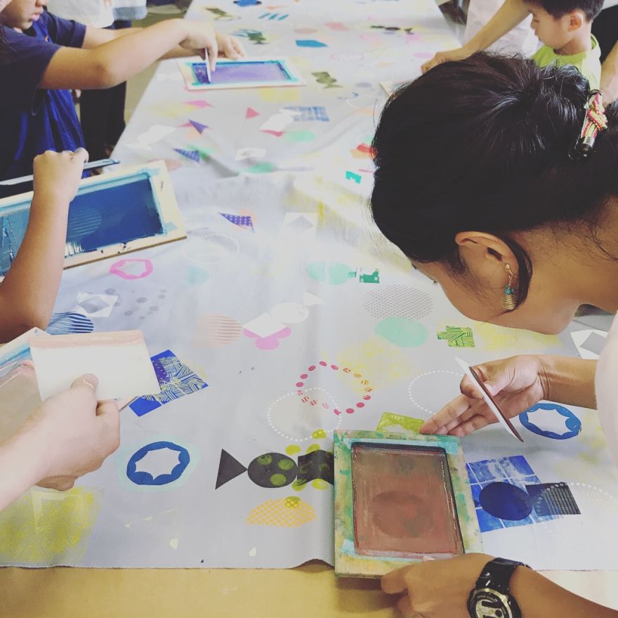 あるものでつくる!みんなで!自由に!とびきり愉快なユニットBOB ho-ho(ボブホーホー)のお二人とシルクスクリーンの手法で布・木・紙など身の回りにあるものに模様をプリントします。ワンポイントでもいいし、誰かの模様に重ねてもいい。最後はみんなでひとつの作品をつくります。いくつかは持ち帰ることもできます。偶然できる色と形を楽しみましょう。