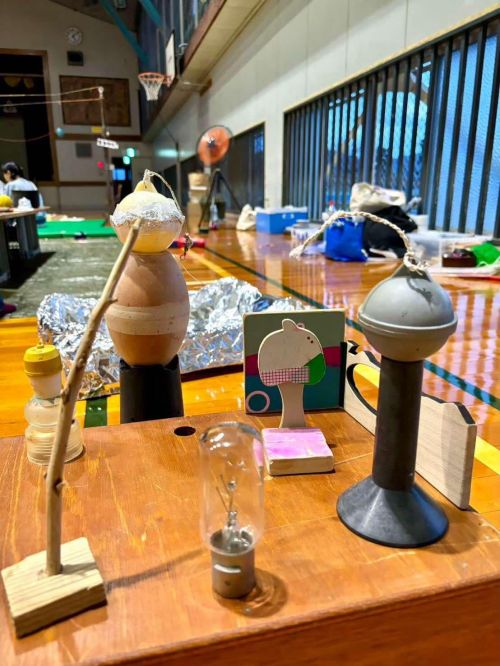 みんなで作ったゴミリス作品を繋げてみよう遊んでみよう展示してみよう。