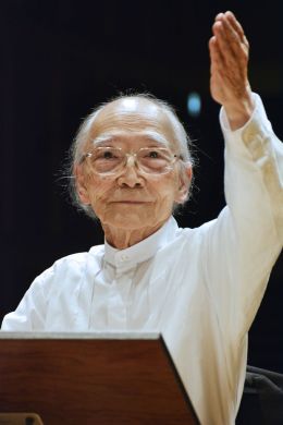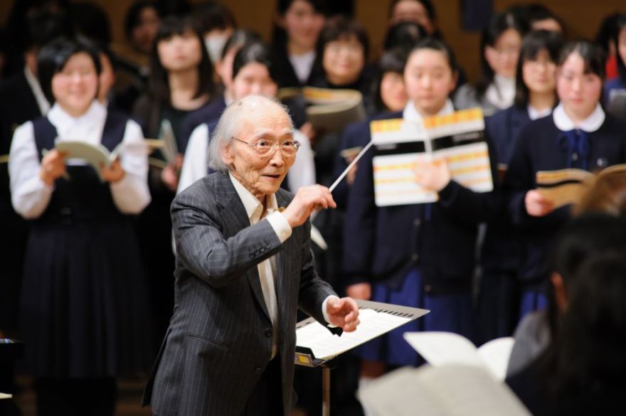 1956年東京藝術大学を卒業と同時に声楽家有志と東京混声合唱団を創立、常任指揮者に就任。今日まで、作曲家と協力して新しい日本の合唱音楽の創造に力を尽くし、東京混声合唱団定期演奏会などで470曲を超える現代合唱曲を初演している。1997年東京混声合唱団より桂冠指揮者の称号を贈られる。2007~13年音楽監督。2007年~16年3月まで理事長。