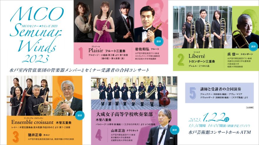 小澤征爾が総監督を務め、日本を代表する演奏家を集めた「水戸室内管弦楽団」のメンバーによる「管楽器アンサンブル・セミナー」を受講した4つのグループが、レッスンの成果を披露します。最後には講師と受講者の合同演奏もあるスペシャル・コンサート。茨城県で活動するフレッシュな高校生から楽器歴数十年のベテランまでの幅広い層の受講生たち、そしてMCOの名手たちによる、管楽器アンサンブルの多彩な音色、美しく力強い響きをどうぞ!