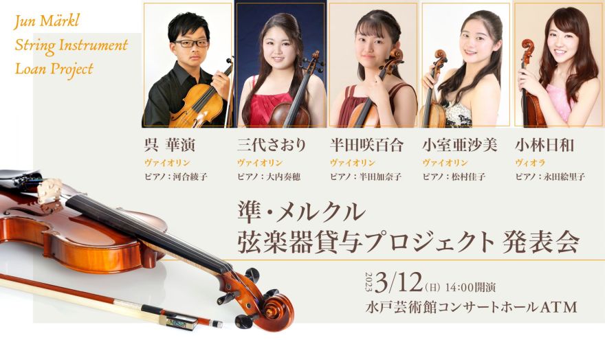 水戸芸術館では、指揮者の準・メルクルさんが寄贈してくださった弦楽器を、30歳以下の茨城の演奏家の方に無償で貸与しています。今回は第4期生のうち5人の出演者が、3年間の学びの集大成を披露します。フレッシュなアーティストたちの飛躍の瞬間に、どうぞご期待ください。