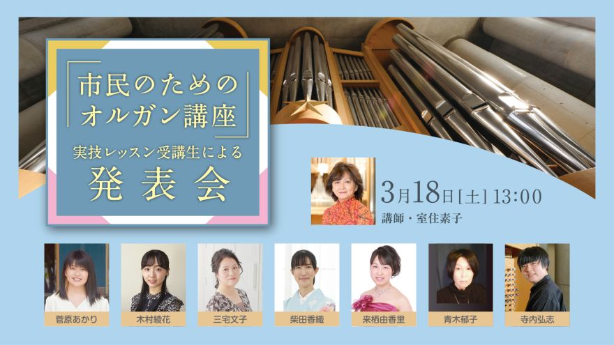 水戸芸術館で毎年人気の「市民のためのオルガン講座」。今回も、学生から社会人まで7名の受講生が、約半年間の練習の成果を発表いたします。ぜひフレッシュな演奏をお楽しみください。