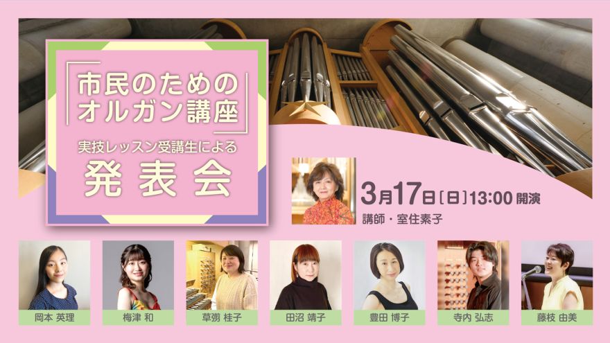 水戸芸術館で毎年人気の「市民のためのオルガン講座」。今回も、学生から社会人まで7名の受講生が、約半年間の練習の成果を発表いたします。ぜひフレッシュな演奏をお楽しみください。