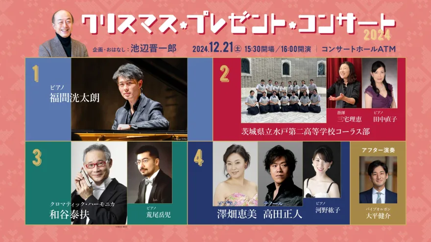 毎年恒例、水戸出身で日本を代表する作曲家・池辺晋一郎氏の企画とお話でお贈りしているクリスマス・プレゼント・コンサート。今年はピアノ、女声合唱、クロマティック・ハーモニカ、声楽の豪華な演奏家たちと一緒に、明るく楽しく華やかに、そしてときにうっとりとする盛りだくさんのクリスマス! 「クリスマス・プレゼント・コーナー」もお楽しみに☆