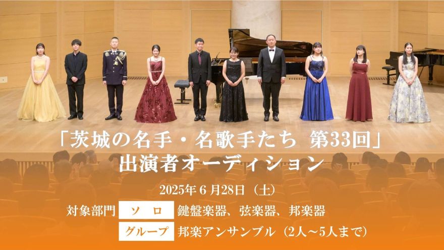 茨城の名手・名歌手たち 第33回 出演者オーディション 参加者募集鍵盤楽器、弦楽器、邦楽器(以上ソロ)、邦楽アンサンブル(2人~5人まで)