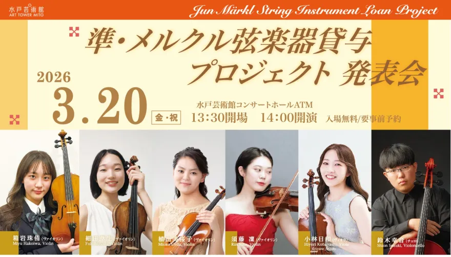 水戸芸術館では、指揮者の準・メルクルさんが寄贈してくださった弦楽器を、30歳以下の茨城の演奏家の方に無償で貸与しています。今回は第5期生のうち6人の出演者が、貸与楽器と過ごした3年間の成果を披露します。これからの飛躍が期待されるフレッシュなアーティストたちの熱演に、どうぞご期待ください。
