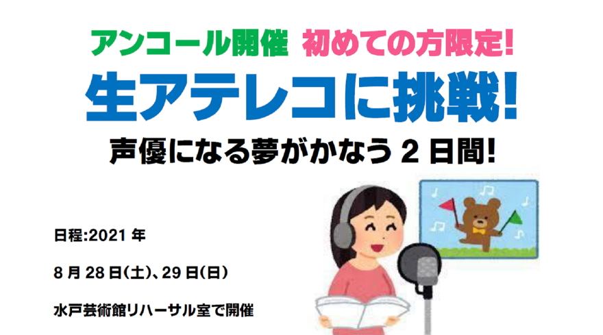 ※【中止のお知らせ】水戸芸術館は「水戸市新型コロナウイルス感染症対策本部」の方針を受け、8月31日(火)まで臨時休館することとなりました。このため、8月28日(土)、29日(日)に開催を予定しておりました「声優チャレンジワークショプ」は中止とさせていただきます。参加申込を頂いていた方には大変申し訳ございません。