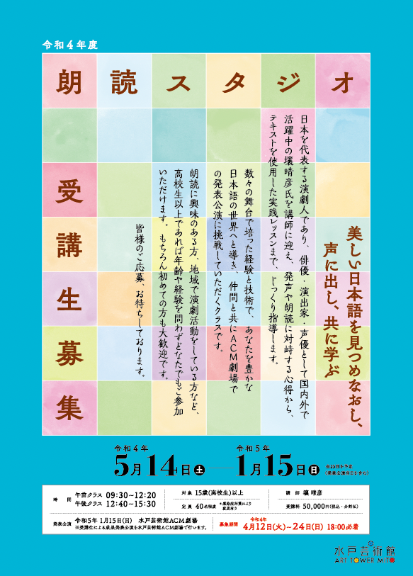 日本を代表する演劇人であり、俳優・演出家・声優として国内外で活躍中の壤晴彦氏を講師に迎え、発声や朗読に対峙する心得から、テキストを使用した実践レッスンまで、じっくり指導します。