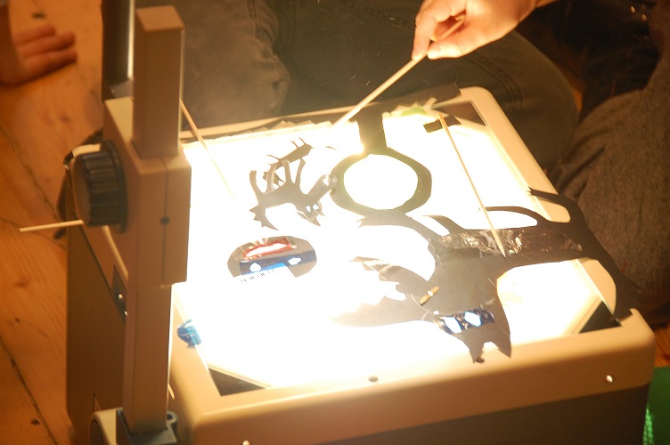 好きな形をスクリーンに投影し、影絵のお芝居を作ってみましょう。