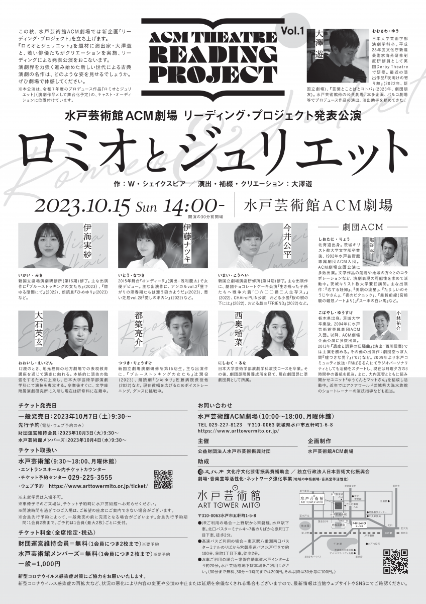 『ロミオとジュリエット』を題材に演出家・大澤遊と、若い俳優たちがクリエーションを実施、リーディングによる発表公演をおこないます。