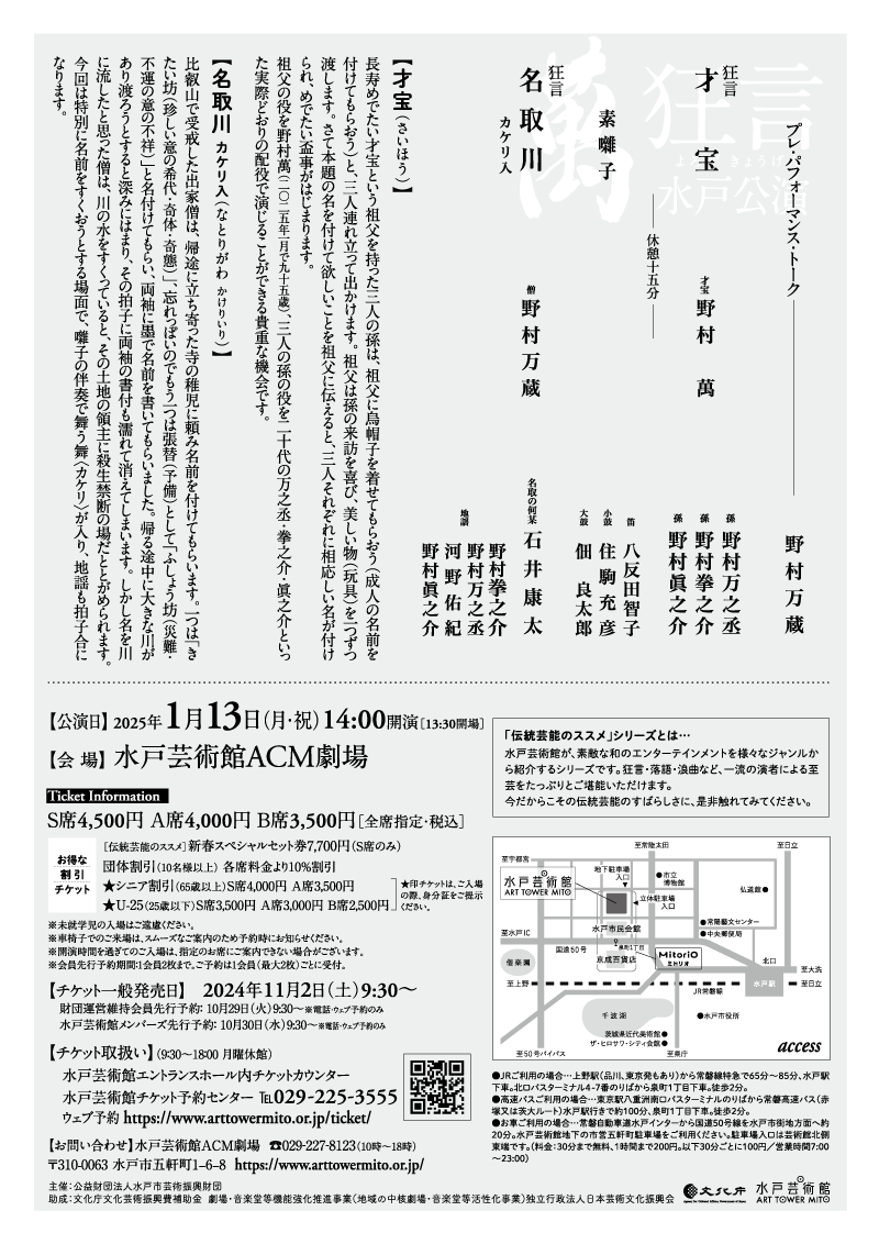 野村万蔵師の楽しいプレ・トーク付きで、狂言を観るのが初めての方でも