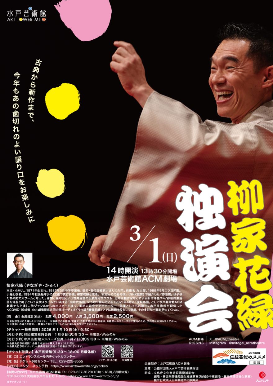 本名・小林九。1971年生まれ。1987年3月中学卒業後、祖父・五代目柳家小さんに入門。前座名 九太郎。1989年9月ニツ目昇進。小緑と改名。1994年戦後最年少の22歳で真打昇進。柳家花緑と改名。「にほんごであそぼ」(NHK教育)で紹介した『寿限無』は子供たちの間で大ブームとなった。着物と座布団という古典落語の伝統を守りつつも、近年は劇作家などによる新作落語や47都道府県落語を洋服と椅子という現代スタイルで口演する「同時代落語」にも取り組んでいる(2021年4月に「茨城落語」として水戸芸術館ACM劇場でも上演)。他ジャンルからのオファーも多く、番組の司会やナビゲーター・俳優としても活躍中。水戸芸術館が配信した<COVID-19対策 公共劇場緊急共同企画オーディオドラマ版『最質前線』>では無線土役として登場、その多彩な一面を見せてくれた。