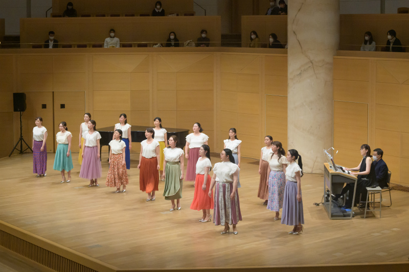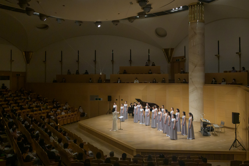 延期決定からの1年半の間には、緊急事態宣言等で思うように練習ができない時期もあり、また進学や就職、結婚、出産などで生活が変わったメンバーもいたそうで、演奏会当日を迎えるまでには沢山の苦労があったと拝察します。しかし当日の歌声は、そんな辛さや苦しさを雲散させるような晴れやかに澄んだ響き! 「水戸の街に響け!300人の《第九》」でもおなじみの小林由佳さんのピアノとエレクトーンが、そこに彩りを加えました。